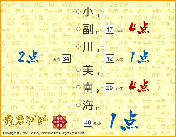生活面を象徴する運勢です。外部から受ける影響力を表し、結婚運、家庭運や職場、環境への順応性を表します。総運から人運を引いた画数。姓や名が1文字の場合を除く。