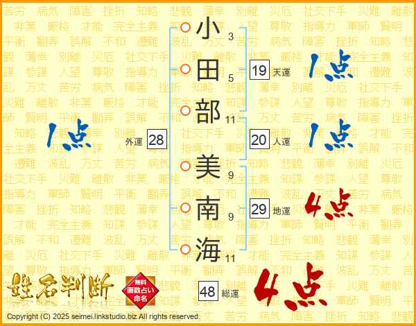 小(3画)田(5画)部(11画) 美(9画)南(9画)海(11画)