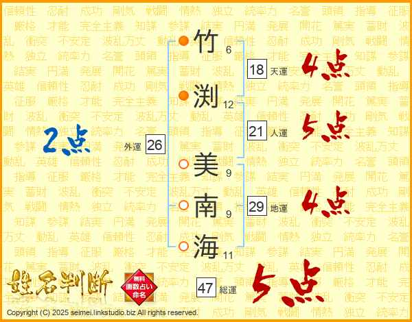 竹(6画)渕(12画) 美(9画)南(9画)海(11画)