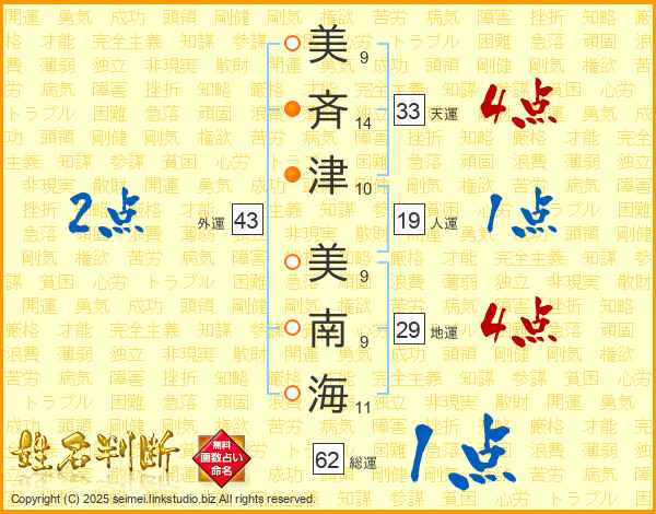 美(9画)斉(14画)津(10画) 美(9画)南(9画)海(11画)