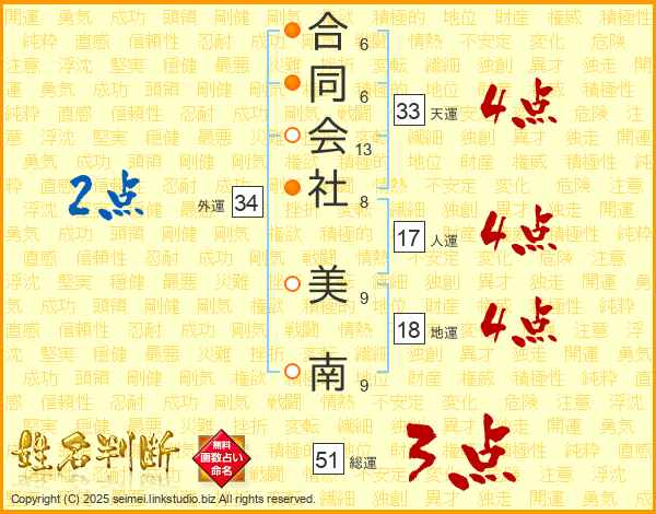 生活面を象徴する運勢です。外部から受ける影響力を表し、結婚運、家庭運や職場、環境への順応性を表します。総運から人運を引いた画数。姓や名が1文字の場合を除く。