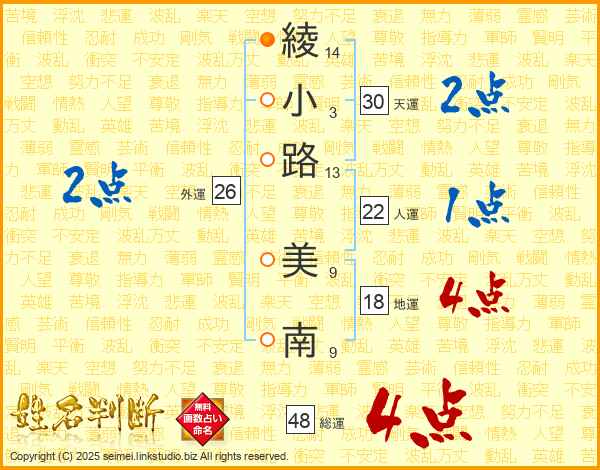 綾(14画)小(3画)路(13画) 美(9画)南(9画)