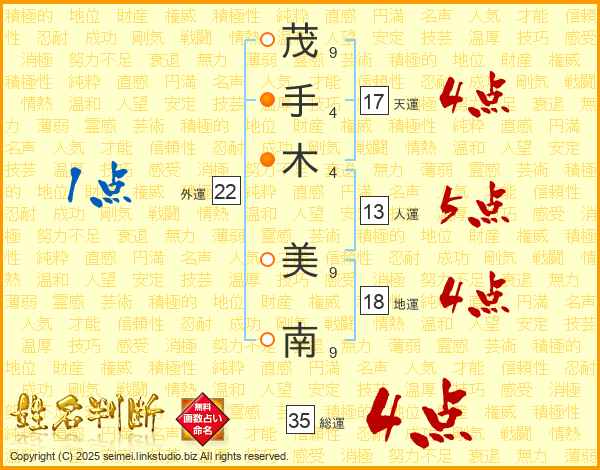 茂(9画)手(4画)木(4画) 美(9画)南(9画)
