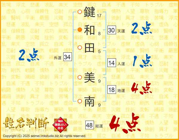 鍵(17画)和(8画)田(5画) 美(9画)南(9画)