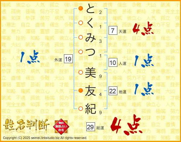 と(2画)く(1画)み(3画)つ(1画) 美(9画)友(4画)紀(9画)