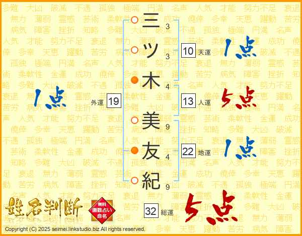 三(3画)ツ(3画)木(4画) 美(9画)友(4画)紀(9画)