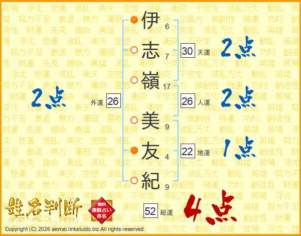 伊(6画)志(7画)嶺(17画) 美(9画)友(4画)紀(9画)