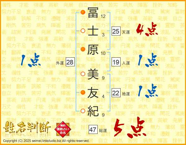 冨(12画)士(3画)原(10画) 美(9画)友(4画)紀(9画)