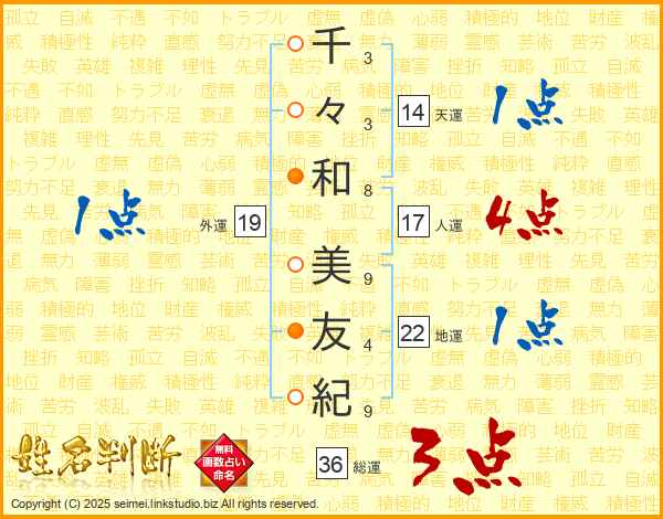 千(3画)々(3画)和(8画) 美(9画)友(4画)紀(9画)