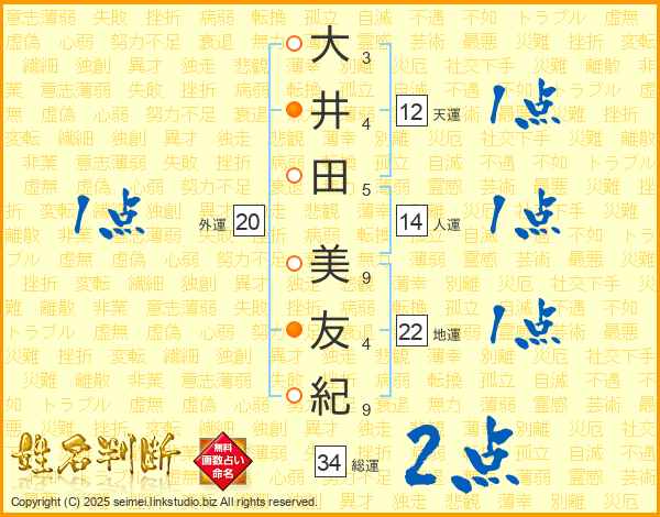 大(3画)井(4画)田(5画) 美(9画)友(4画)紀(9画)