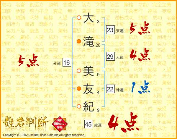 大(3画)滝(20画) 美(9画)友(4画)紀(9画)