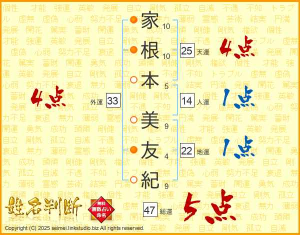 家(10画)根(10画)本(5画) 美(9画)友(4画)紀(9画)