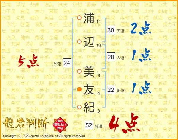 浦(11画)辺(19画) 美(9画)友(4画)紀(9画)