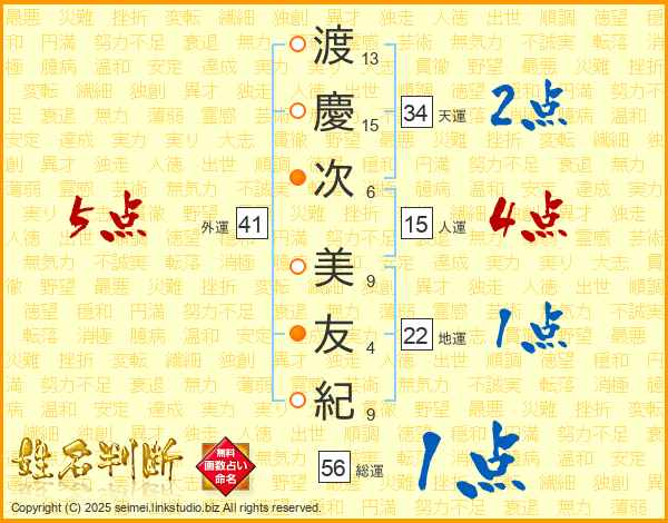 渡(13画)慶(15画)次(6画) 美(9画)友(4画)紀(9画)