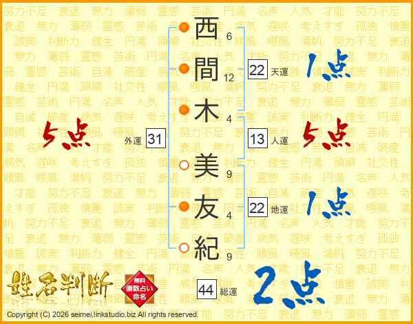 西(6画)間(12画)木(4画) 美(9画)友(4画)紀(9画)