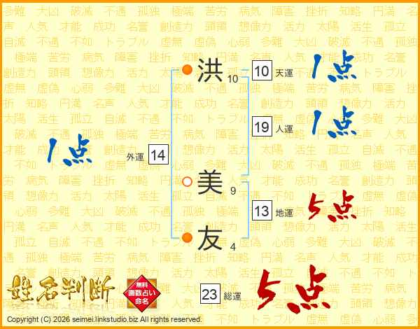 生活面を象徴する運勢です。外部から受ける影響力を表し、結婚運、家庭運や職場、環境への順応性を表します。総運から人運を引いた画数。姓や名が1文字の場合を除く。
