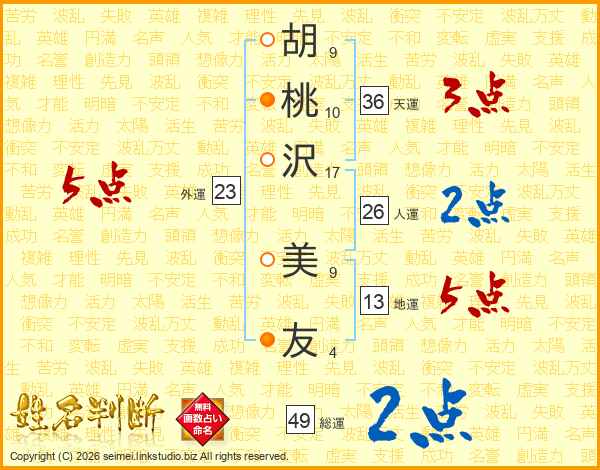 胡(9画)桃(10画)沢(17画) 美(9画)友(4画)