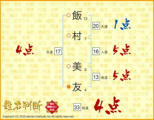 飯(13画)村(7画) 美(9画)友(4画)