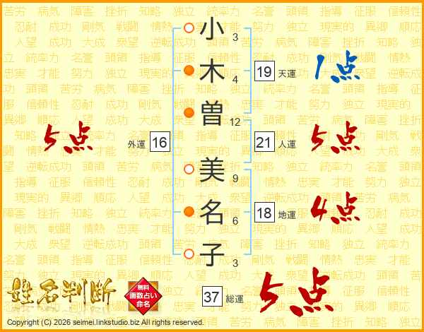 小(3画)木(4画)曽(12画) 美(9画)名(6画)子(3画)