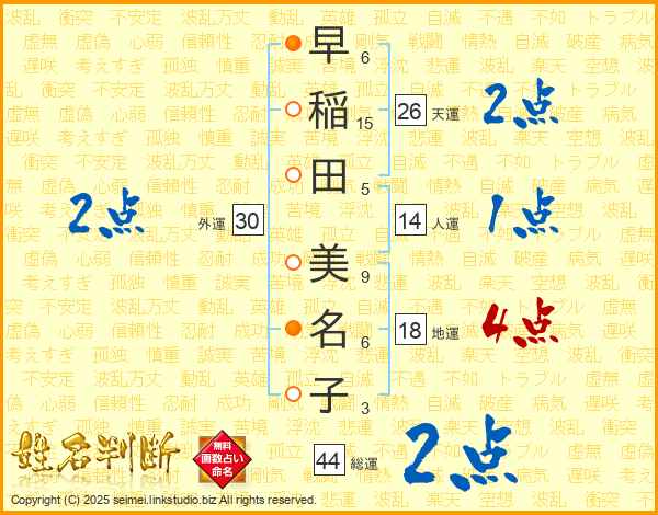 早(6画)稲(15画)田(5画) 美(9画)名(6画)子(3画)