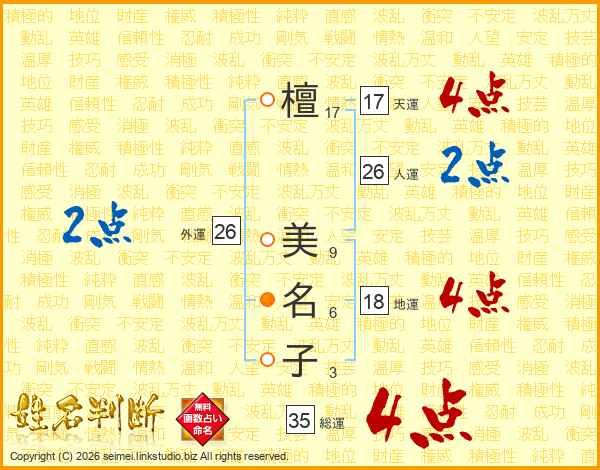 檀(17画) 美(9画)名(6画)子(3画)