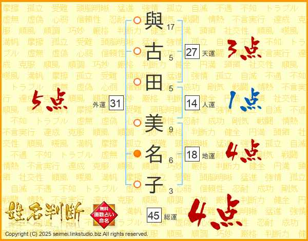 與(17画)古(5画)田(5画) 美(9画)名(6画)子(3画)