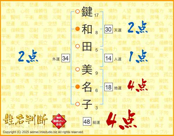 鍵(17画)和(8画)田(5画) 美(9画)名(6画)子(3画)