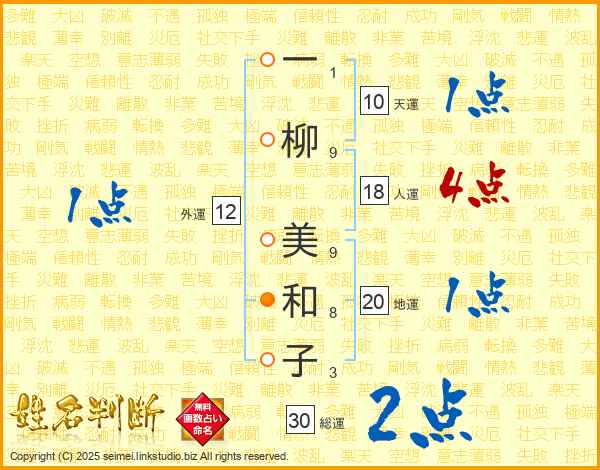 一(1画)柳(9画) 美(9画)和(8画)子(3画)