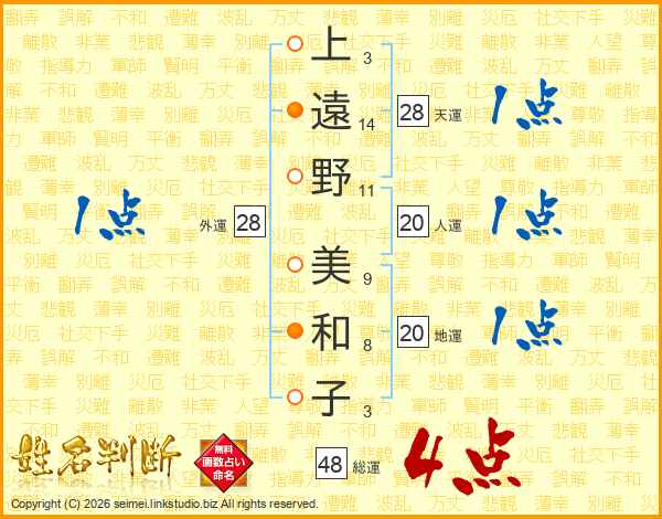 上(3画)遠(14画)野(11画) 美(9画)和(8画)子(3画)