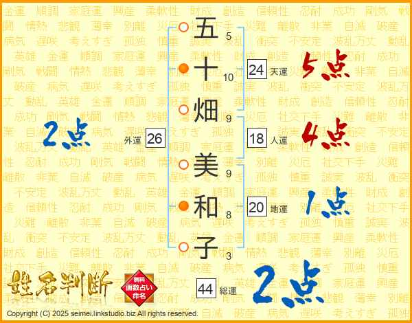 五(5画)十(10画)畑(9画) 美(9画)和(8画)子(3画)