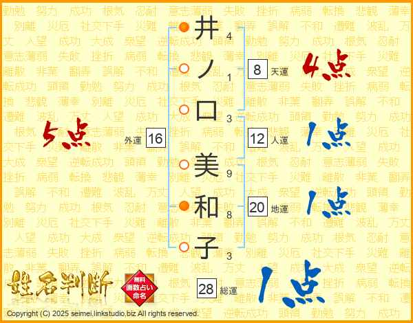 井(4画)ノ(1画)口(3画) 美(9画)和(8画)子(3画)