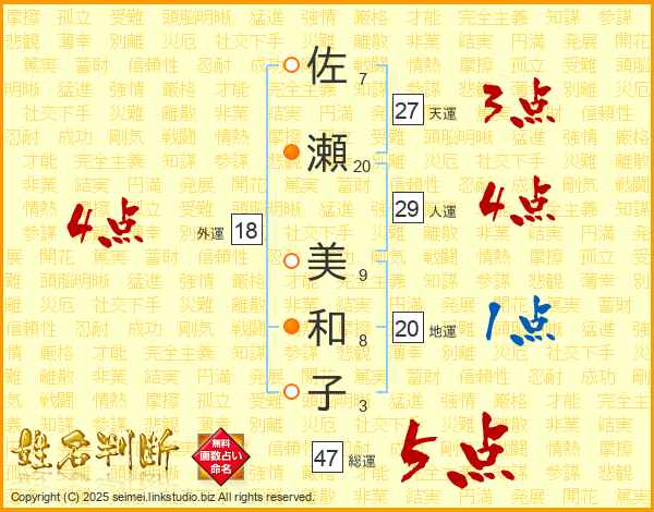 佐(7画)瀬(20画) 美(9画)和(8画)子(3画)