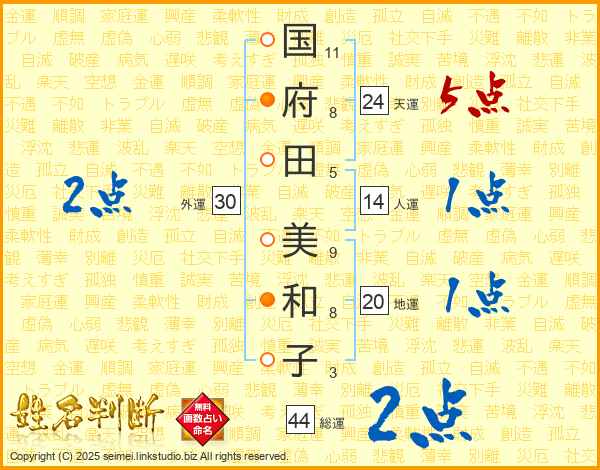 国(11画)府(8画)田(5画) 美(9画)和(8画)子(3画)