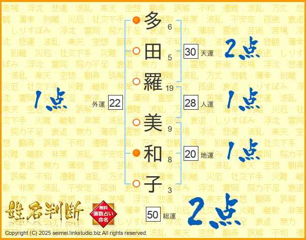 多(6画)田(5画)羅(19画) 美(9画)和(8画)子(3画)