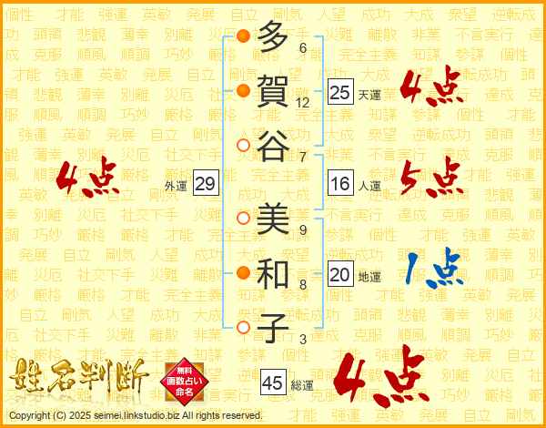 多(6画)賀(12画)谷(7画) 美(9画)和(8画)子(3画)
