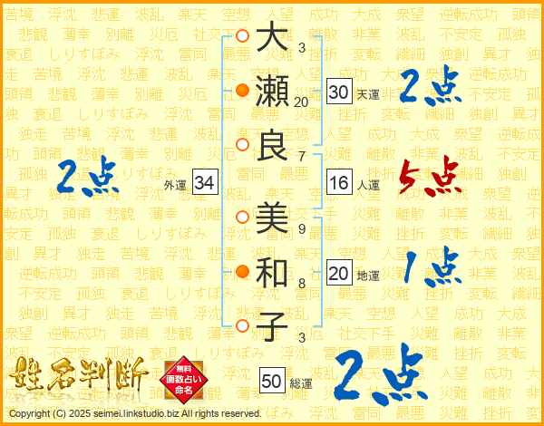 大(3画)瀬(20画)良(7画) 美(9画)和(8画)子(3画)