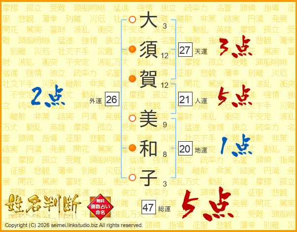 大(3画)須(12画)賀(12画) 美(9画)和(8画)子(3画)