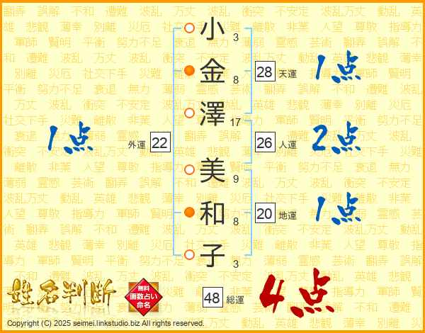小(3画)金(8画)澤(17画) 美(9画)和(8画)子(3画)