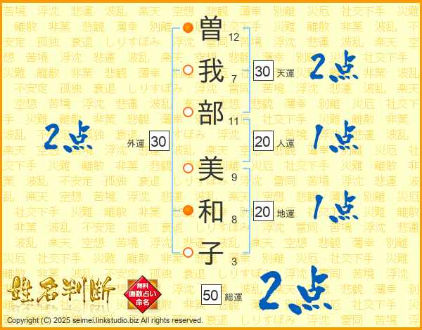 曽(12画)我(7画)部(11画) 美(9画)和(8画)子(3画)
