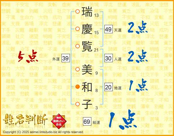 瑞(13画)慶(15画)覧(21画) 美(9画)和(8画)子(3画)