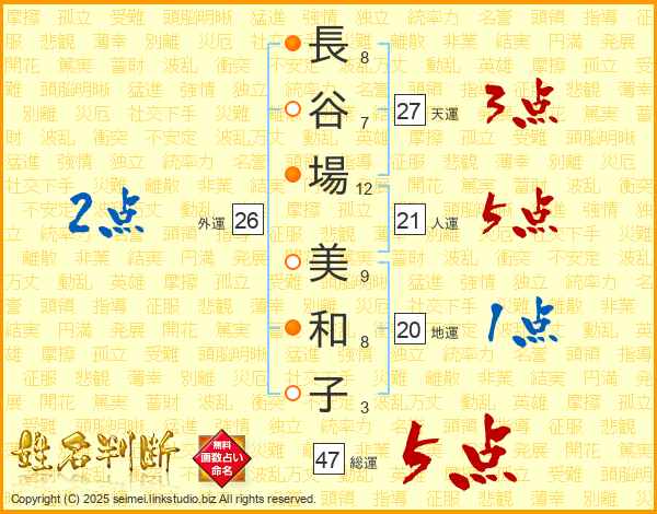 長(8画)谷(7画)場(12画) 美(9画)和(8画)子(3画)