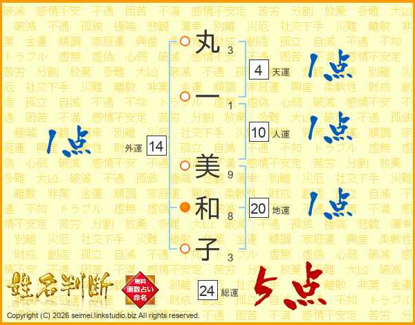 丸(3画)一(1画) 美(9画)和(8画)子(3画)