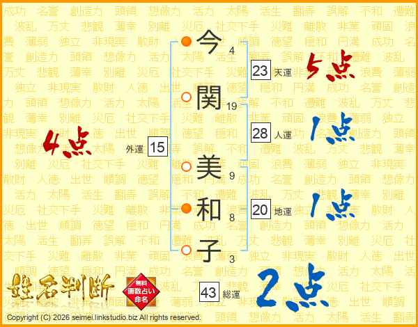 今(4画)関(19画) 美(9画)和(8画)子(3画)