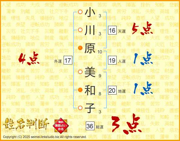 小(3画)川(3画)原(10画) 美(9画)和(8画)子(3画)