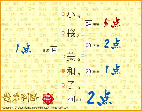 小(3画)桜(21画) 美(9画)和(8画)子(3画)