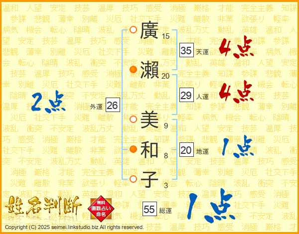 廣(15画)瀨(20画) 美(9画)和(8画)子(3画)