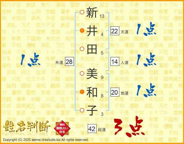 新(13画)井(4画)田(5画)  美(9画)和(8画)子(3画)
