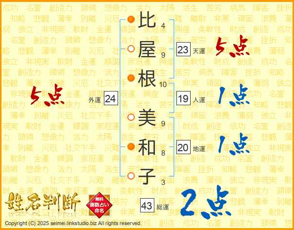 比(4画)屋(9画)根(10画) 美(9画)和(8画)子(3画)