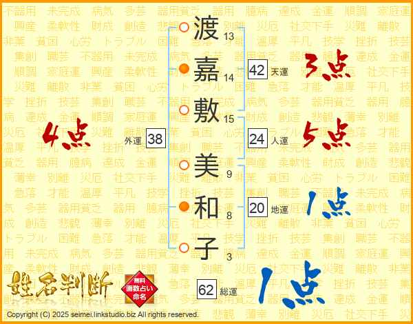 渡(13画)嘉(14画)敷(15画) 美(9画)和(8画)子(3画)