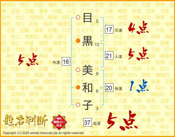 目(5画)黒(12画) 美(9画)和(8画)子(3画)